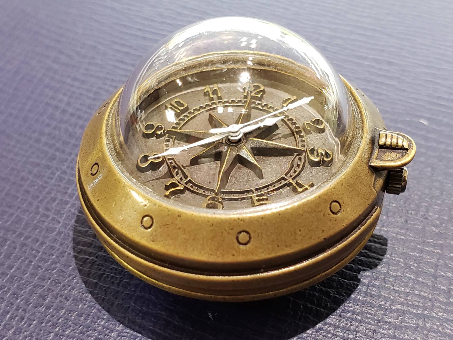 クォーツ時計でございます。 かなり高いドーム風防に羅針盤のよう文字盤と、とても面白いデザインです。 針が動いているのをみるのが楽しくなる時計ですね!