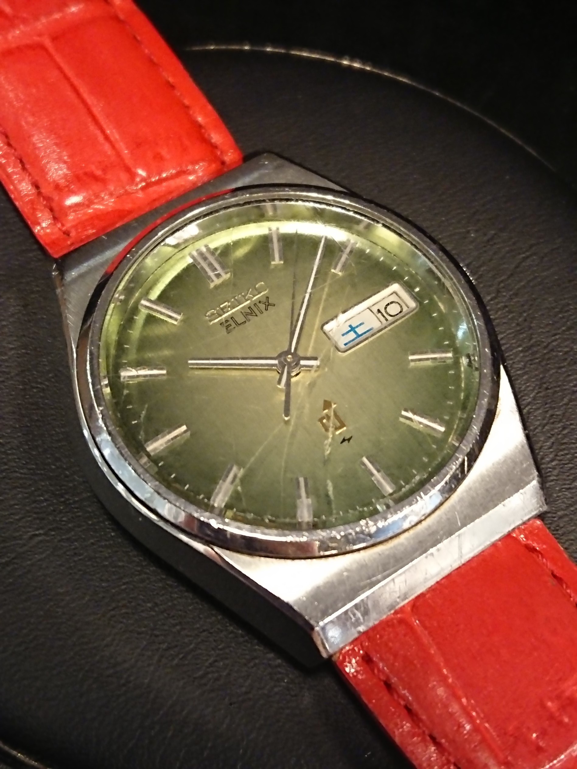 電池を動力に機械式の構造で時を刻む、電子テンプ式です。セイコーの電子テンプ式にもいくつかの種類がありましたが、エルニクスは最晩期のモデルでもあります。それ以降、一気にクォーツ時代へ突入することになります。