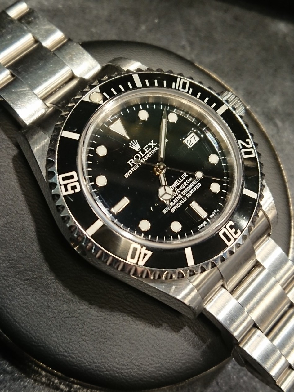 ファーストモデルでは610m防水でしたが、この度承りました16600は、1220m防水へと大幅スペックアップ。サブマリーナと外観は殆ど変わりませんが、最大の違いは、9時位置にあるヘリウムガスエケープバルブと、カレンダーのサイクロップレンズがないことでしょう。