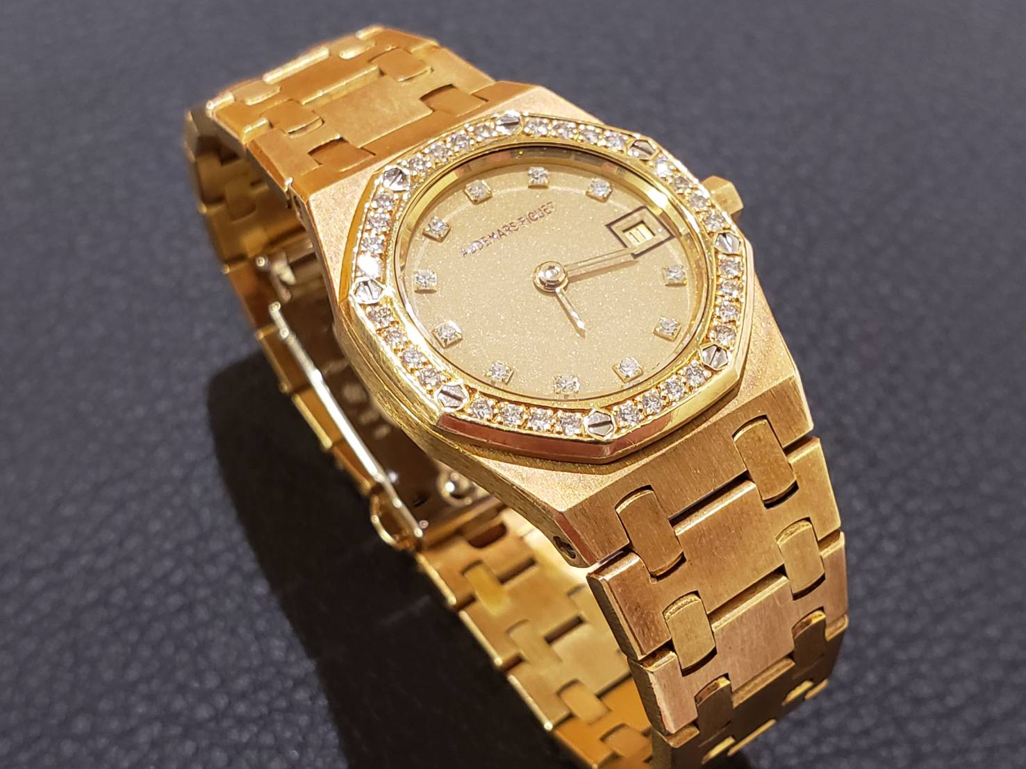 オーデマ・ピゲ ロイヤルオークでございます。 オーデマ・ピゲの象徴的なモデルです。ベゼルに並べられた石が輝いていてとても美しいです。 こちらは他店で断られてしまったものをお持ち込みいただきました。どのようなモデルでも当店では承っておりますので、あきらめる前にぜひ一度ご相談下さい!