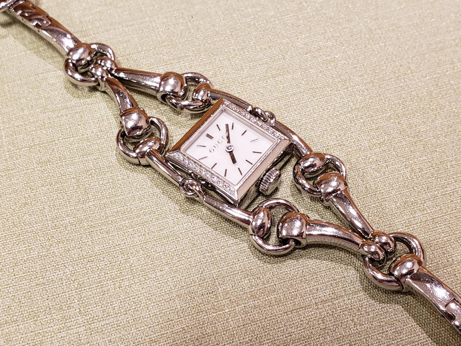 グッチでございます。 まるでブレスレットのようなバンドが美しく、さすがグッチというようなデザインですね。 こちらは電池が液漏れしていて不動だったので、オーバーホールでお預かり致しました。 電池を切れたまま放置していると液漏れが発生し、最悪の場合機械が壊れてしまいます。修理代金が高額になってしまうので、電池切れの場合はお早めにご相談下さい!