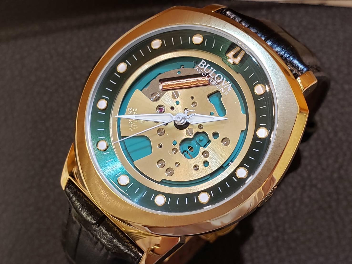 ブロ-バ アキュトロンIIでございます。 こちらはクォーツ時計が開発される前の1960年にブロ-バによって開発された音叉時計です。 当時これまでの時計とはまるで違う高振動、高精度の時計で、とても画期的な発明でした。 現在でもスムーズな運針、変わった機構により根強いファンが存在し、復刻版も発売されています。