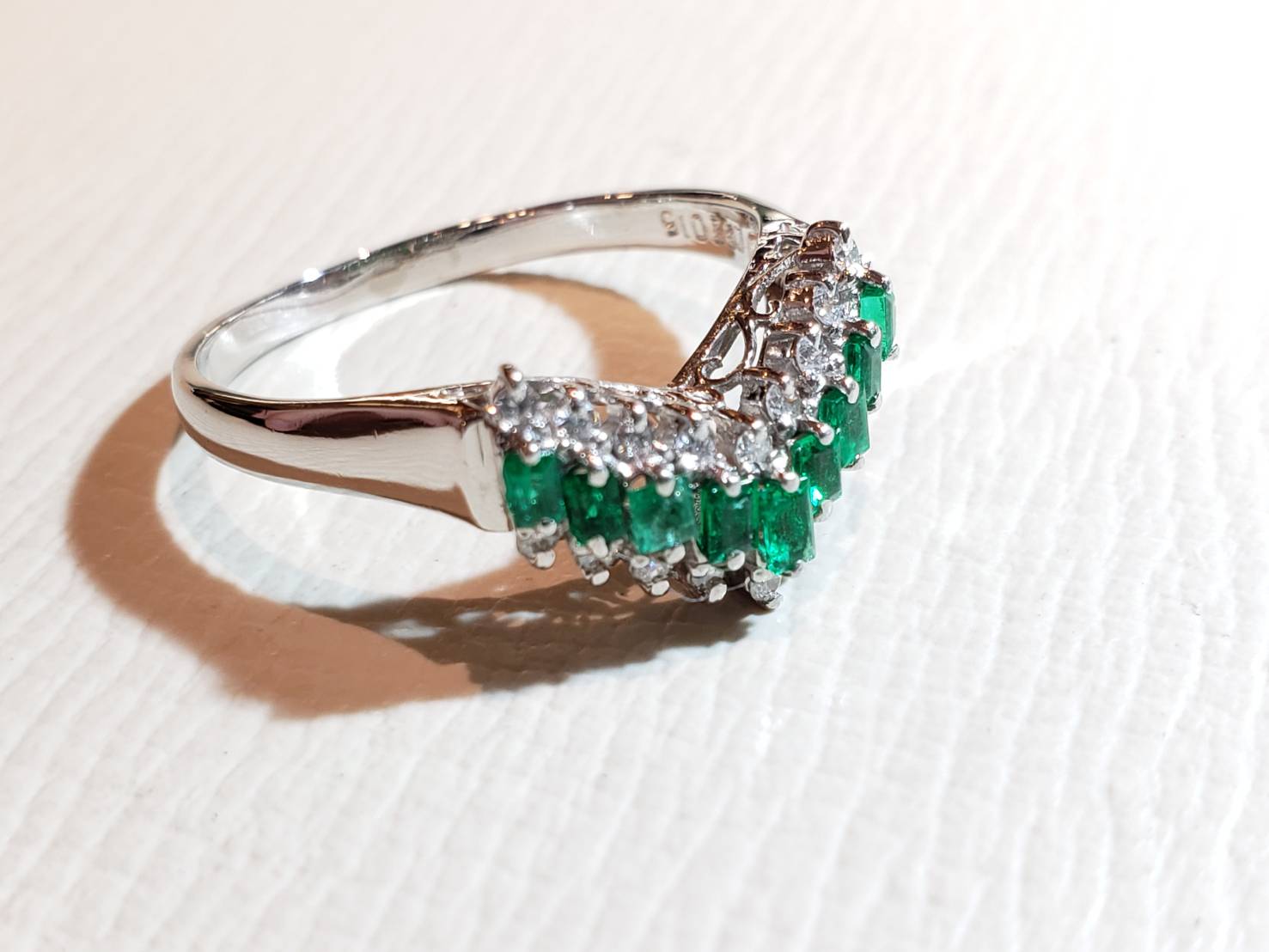 こちらはサイズ直しでお預かり致しました! メレに飾られた緑色の宝石が美しく並んでいます。