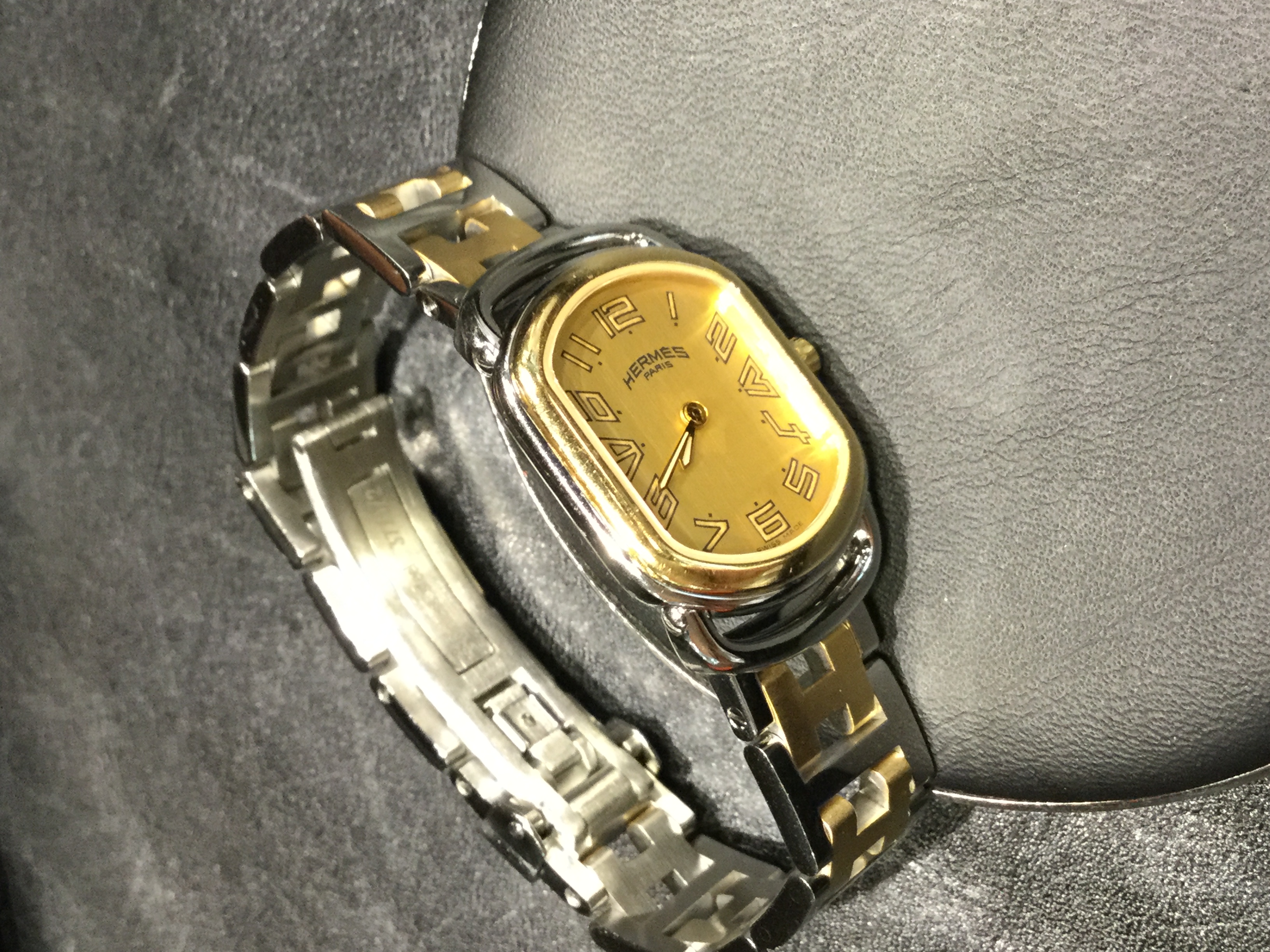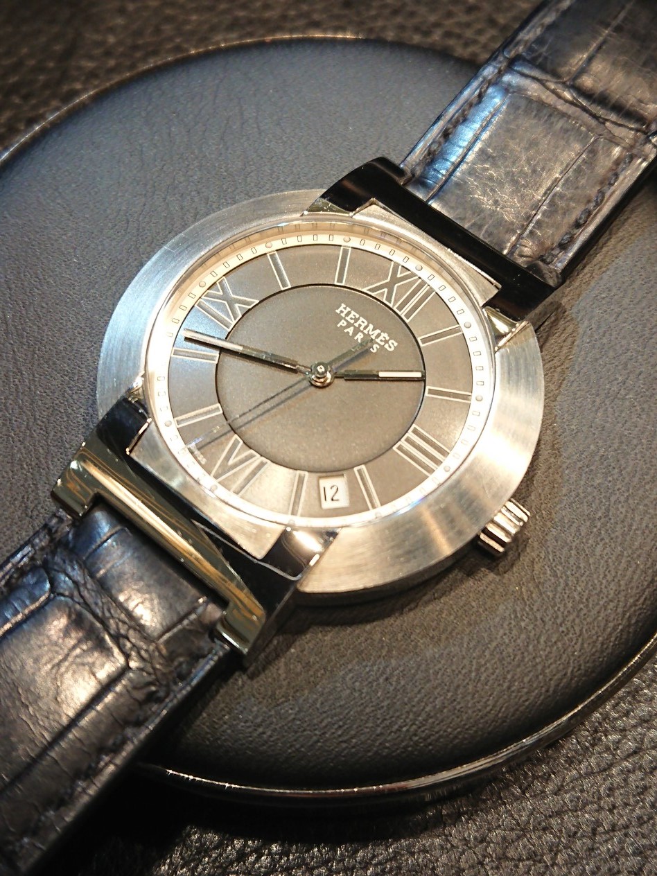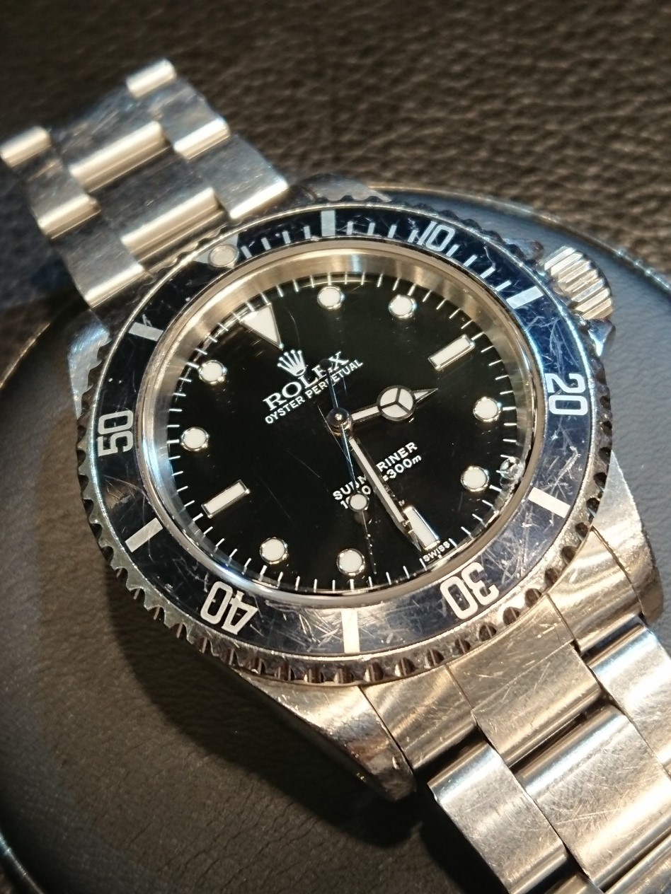 お持ちいただいた時計は、竜頭が奥までねじ込めなくなっておりました。そして、持続時間が凄く短いとのこと。点検しますと、ゼンマイ劣化があり自動巻機構の切換え車が摩耗しておりました。洗浄して傷んだ部品を交換し、竜頭を交換しました。外装の研磨もご依頼いただきピカピカになっております(ベゼルは除く)。