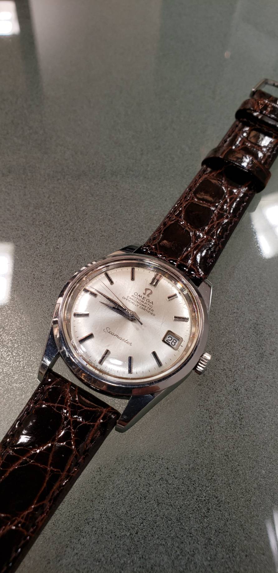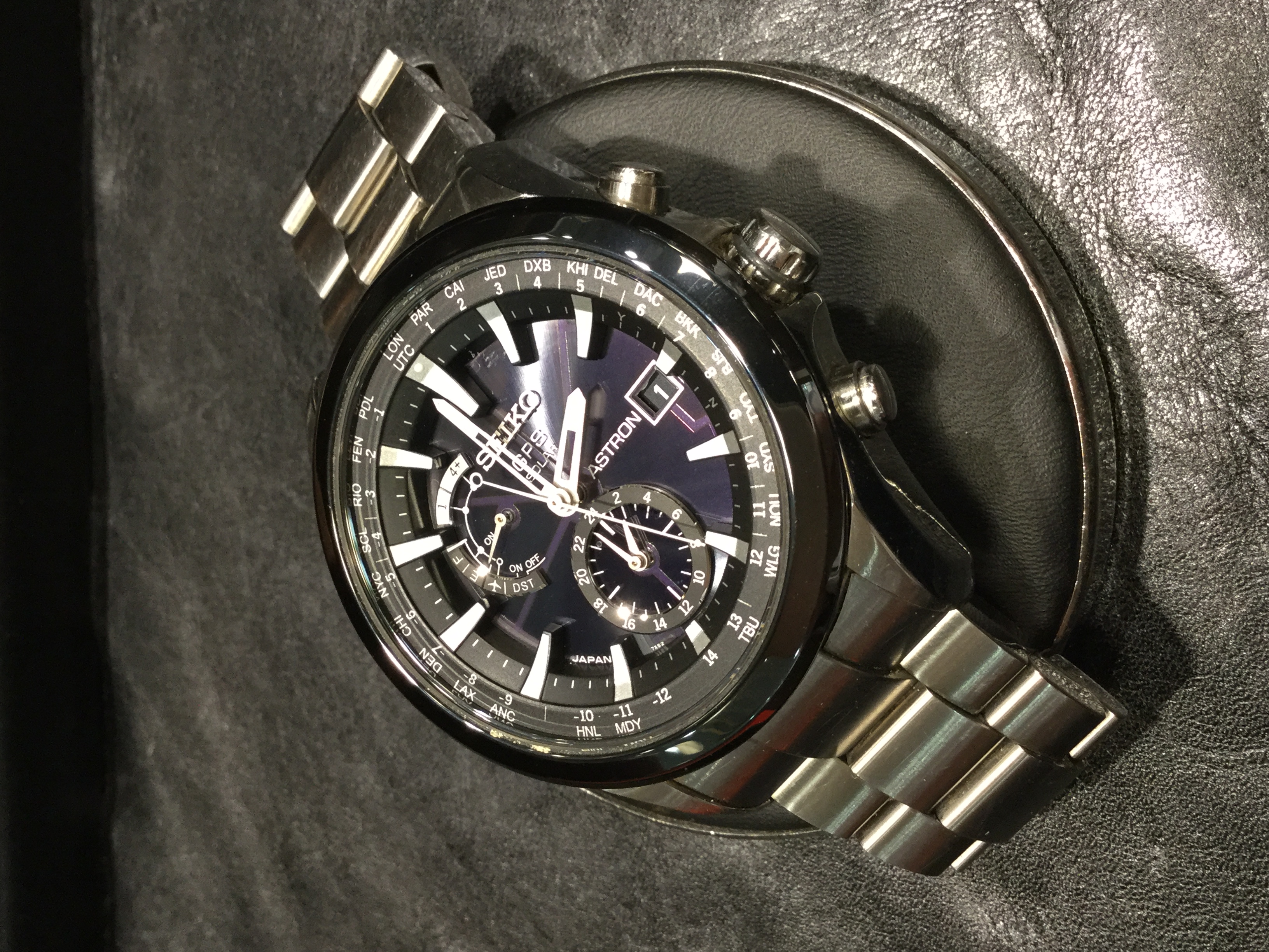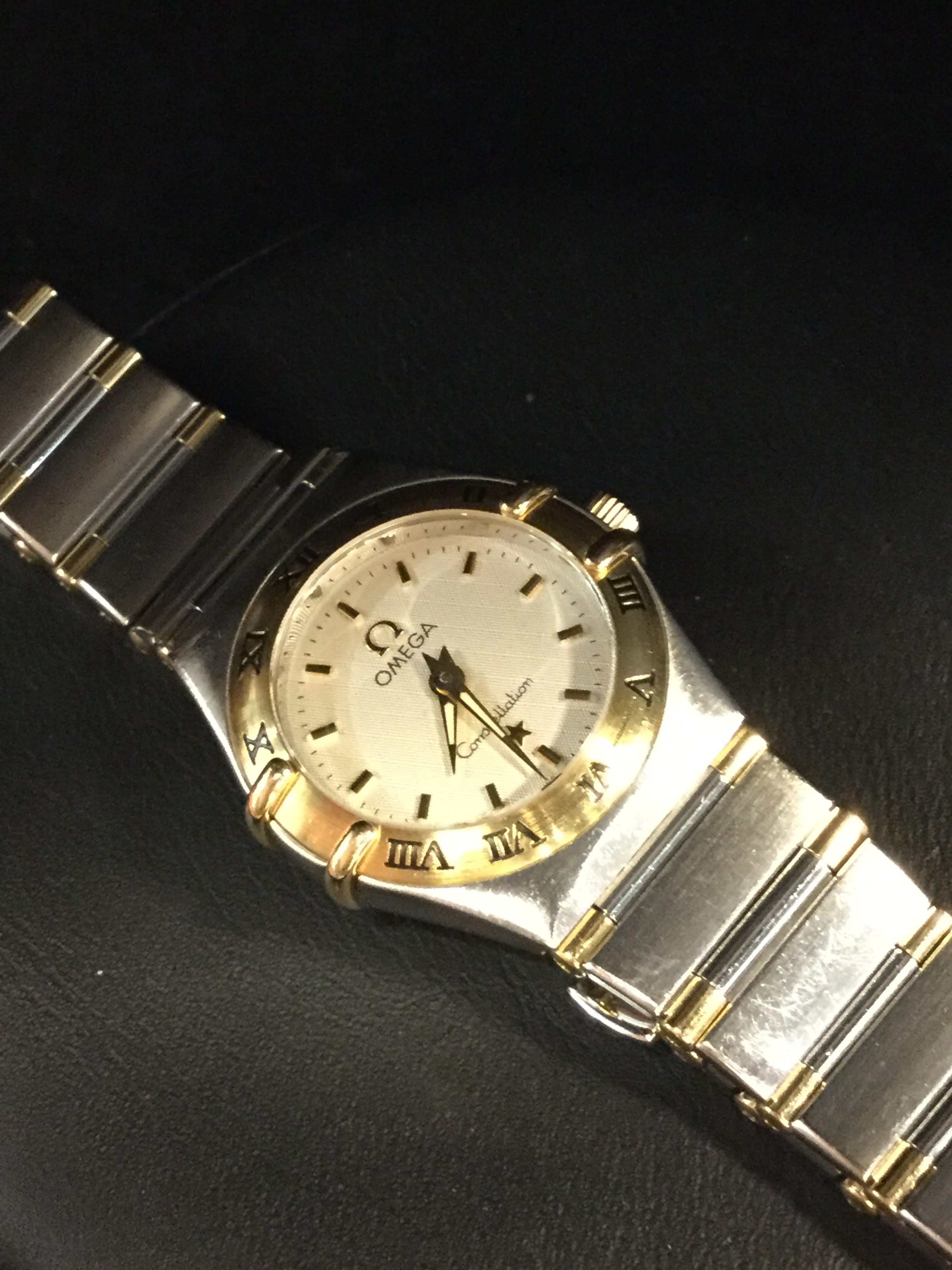 お持ちいただいた時計は、竜頭が奥までねじ込めなくなっておりました。そして、持続時間が凄く短いとのこと。点検しますと、ゼンマイ劣化があり自動巻機構の切換え車が摩耗しておりました。洗浄して傷んだ部品を交換し、竜頭を交換しました。外装の研磨もご依頼いただきピカピカになっております(ベゼルは除く)。
