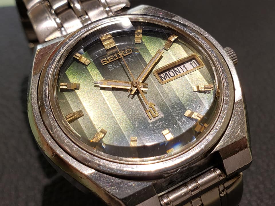 【SEIKO】 この度電池交換でお預かり致しました時計は、SEIKOのエルニクスでございます。 こちらは電磁テンプ式と呼ばれる時計で、クォーツ式腕時計が開発された1970年代前後に作られていた、電池式の時計です。 機械式のようなテンプを電磁石で動かす仕組みで、高振動と安定した動力でクォーツには及ばないもののかなりの高精度を誇る時計です。 70年代の時計によく見られるカットガラスが光を反射して、文字盤の美しい色と合わさりとても綺麗なデザインとなっています。