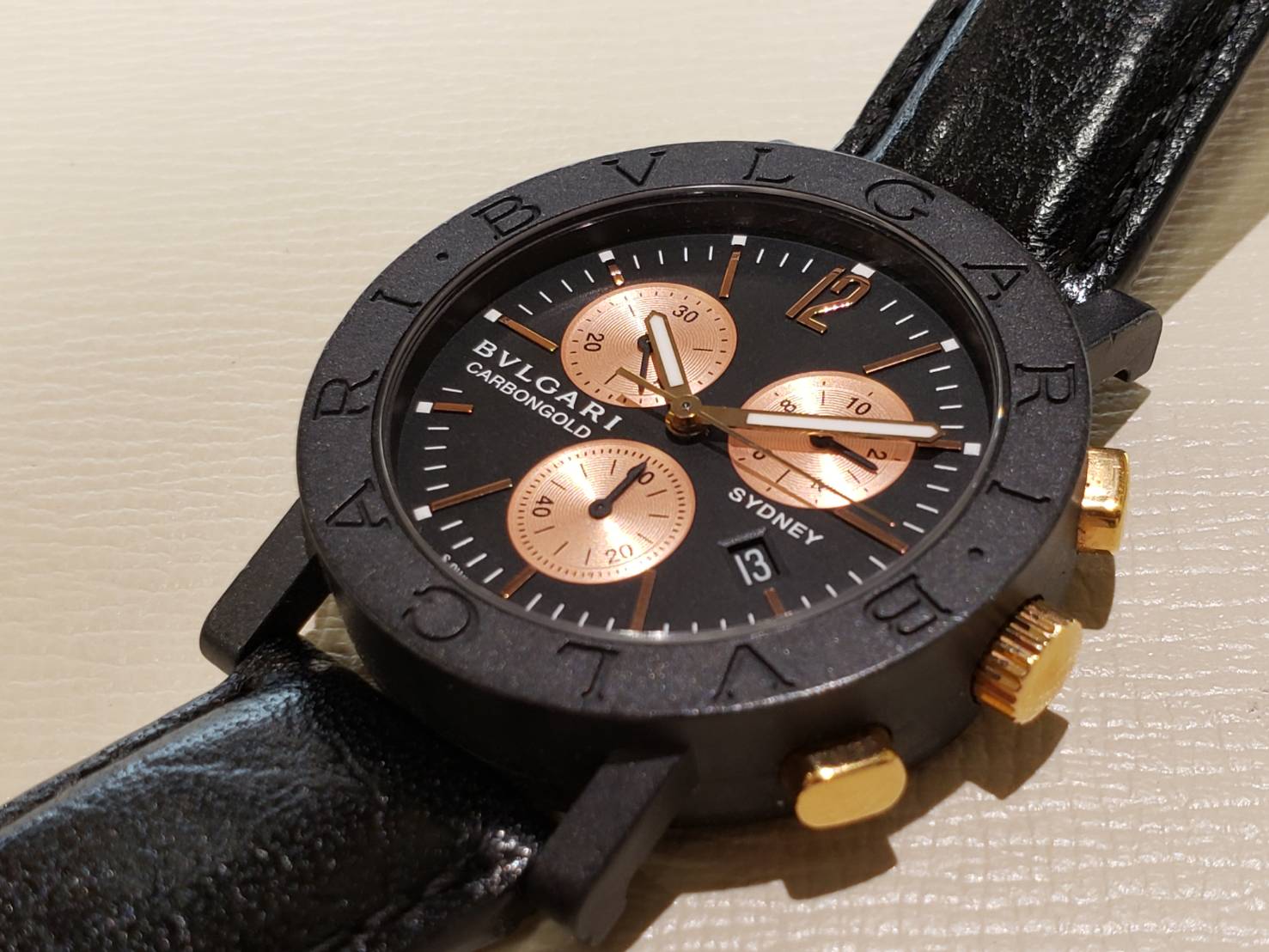 ブルガリのカーボンゴールドでございます。 カーボン加工されたケースが特徴で、独特の素材感がありとても軽量です。 黒と金を合わせた一目でおしゃれだと分かるデザインですね。