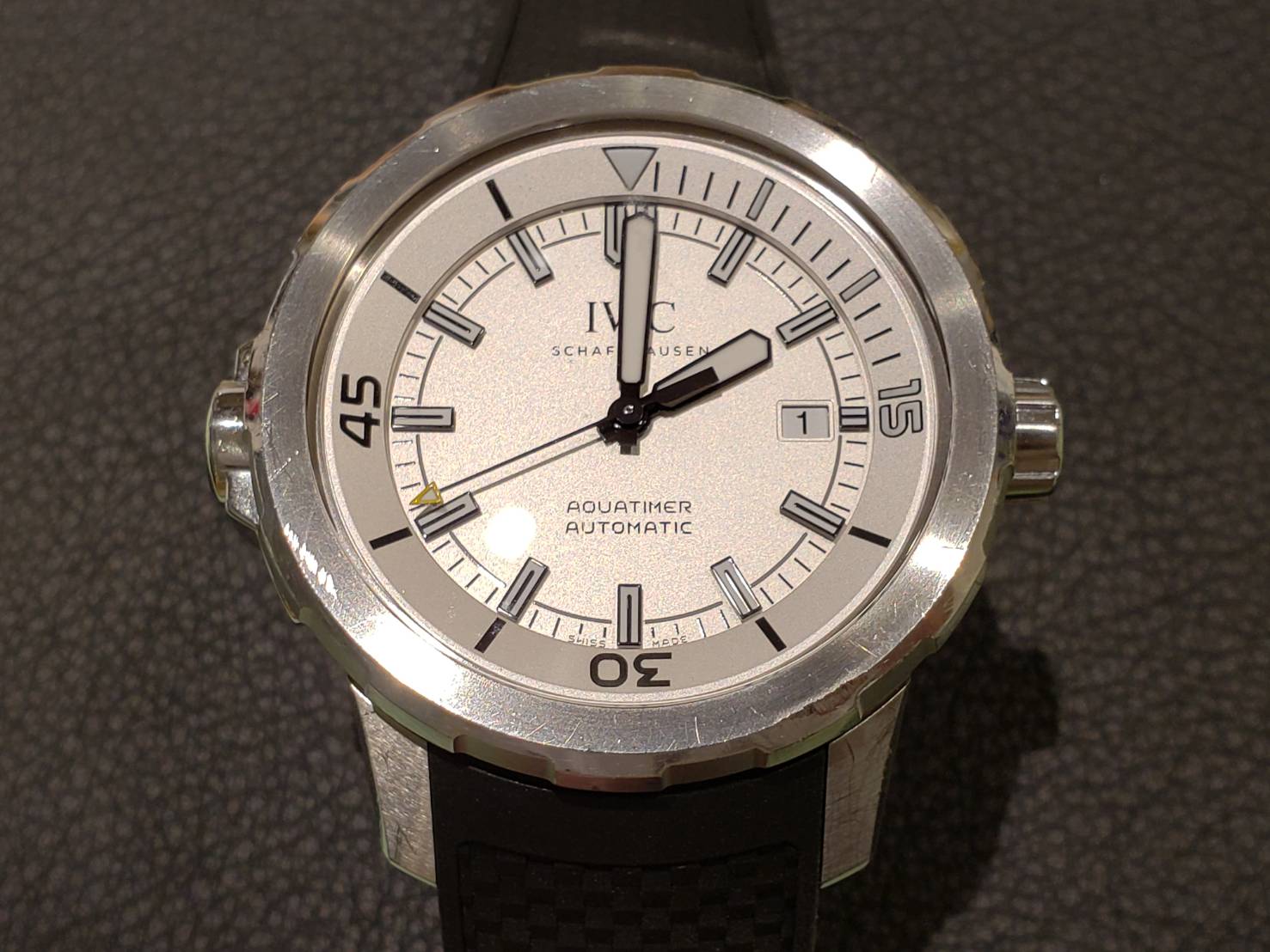 IWCのアクアタイマーでございます。 こちらは、文字盤のインデックスが2ヶ所外れていた状態でした。 衝撃などで文字が外れてしまうことがあります。時計を着ける際はぶつけたり、落とさないようご注意くださいませ。