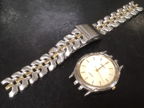 この度お預かりいたしました時計は、セイコーのドルチェの時計でございます。 コンビのベルトがとても上品でエレガントですね。 この度は電池交換とベルトのクリーニングでお預かりいたしました。