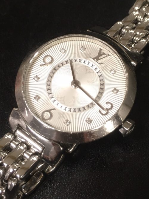 この度お預かりいたしました時計は、ルイヴィトンの時計でございます。 白色と銀色で綺麗に統一されていて、文字盤は光の当たり方によってモノグラムの柄が見えます。