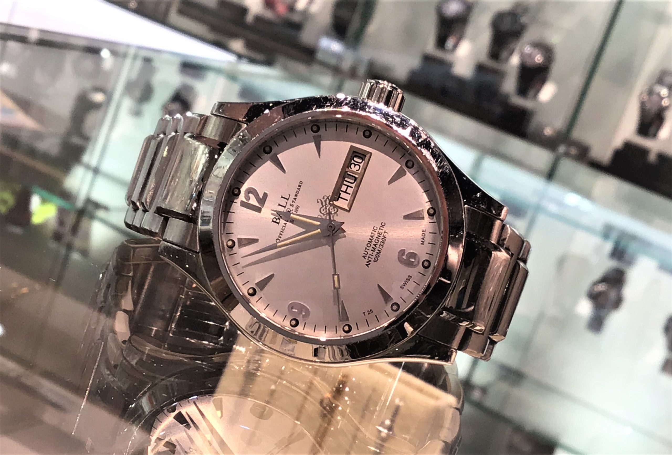 こちらは、針とインデックスに「マイクロ・ガスライト」を搭載した『ボールウォッチ』の時計です。 「マイクロ・ガスライト」とは比較的新しい夜光で、蓄光式ではなく自発光する夜光で、 どんな状況下においても時刻を読み取りやすくするために開発されたものです。 時計機能としては、3針・デイデイト・シルバー色文字板で、シーンを問わず着用でき、 シンプルなデザインなので飽のこない佇まいとなっています。