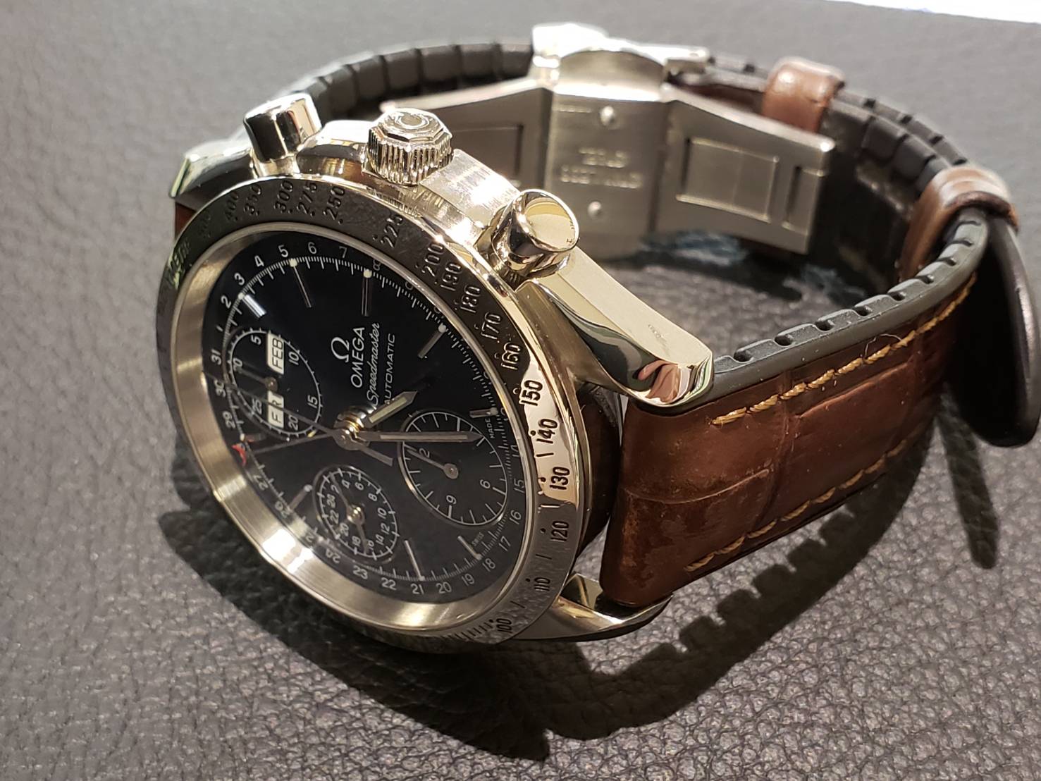 オメガスピードマスターのトリプルカレンダーでございます。 綺麗な放射状青文字盤とトリプルカレンダーとクロノグラフと多機能にもかかわらずシンプルにまとまったデザインがクールでカッコいいです🥰 こちらはお客様がお父様から譲られた大切なお品で、遅れの症状が出始めたのでお持ち込みくださいました。 油が劣化してくると遅れなどの症状があらわれてきます。そういった時計をおもちでしたらお早めにオーバーホールをご検討ください!