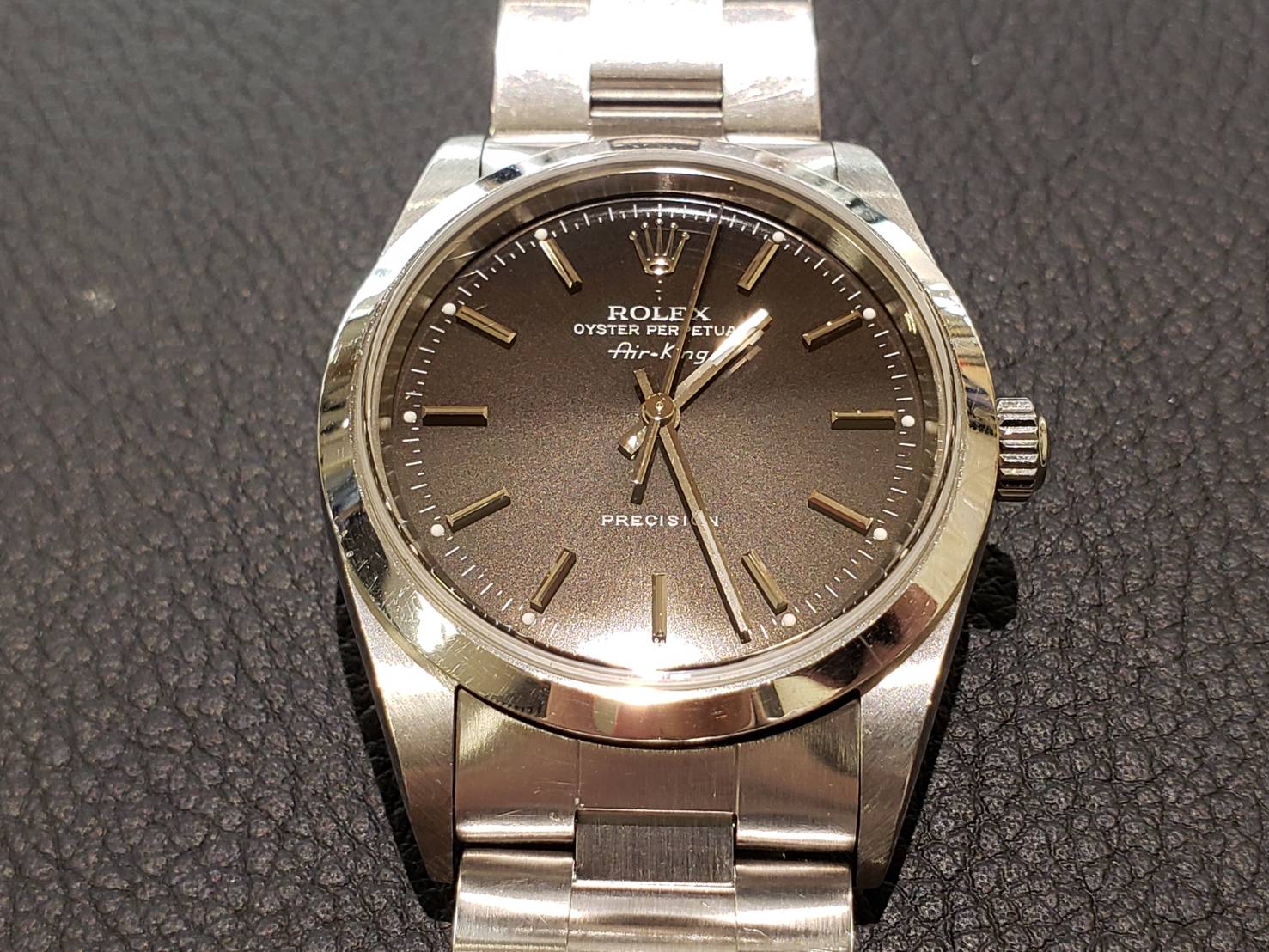 ROLEXのエアキングでございます。 ROLEXの入門機という位置付けながら小型でシンプルなデザインが愛好家からの支持も強いモデルです。 デイトジャストなどと比べると、少しだけケース径が小さくスーツにもよく合う時計です。 こちらは奥様からのプレゼントだそうですが、不動の症状が出ていました。 またご愛用いただけるよう誠心誠意お修理させていただきました!