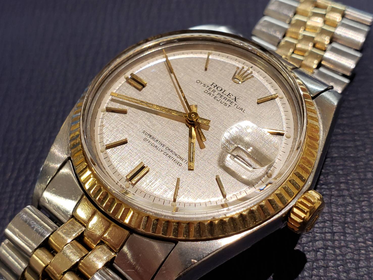ROLEXのデイトジャストでございます。 こちらアンティークのお品で、綺麗な白い絹目の文字盤とコンビケースが非常にマッチしています。 症状としてはリューズを引いても針回しが出来なくなってしまっています。 ガラス傷が多いため、ガラスの交換も承りました!