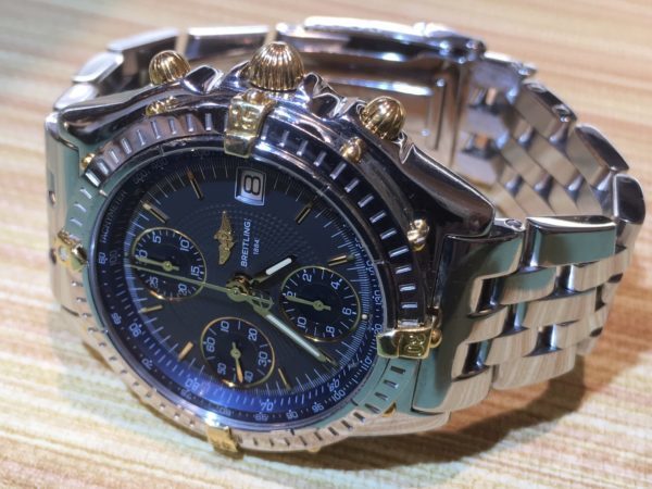 ブライトリングでございます。 スモールセコンドの青色がとても綺麗で、金色ととてもマッチングしています。 以前にお修理したそうですが、また動かなくなってしまったのでお持ちいただきました。
