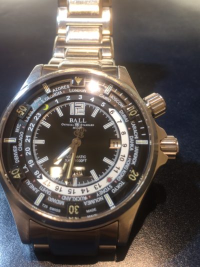 ボールウォッチでございます。 ワールドタイマーは世界主要都市の時刻が一目で確認でき操作性にも優れています。また、300mの防水機能がついていて、とてもカッコイイですね! 特に不具合はありませんでしたが、オーバーホール時期がきたので、お預け頂きました。