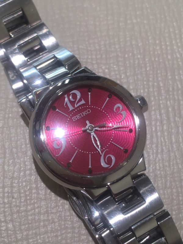 セイコーのルキアの時計でございます。 綺麗なピンク色の文字盤で、光の当たり方で色が変わりとてもおしゃれです。 ご購入から約8年が経ち、不具合が出てきたので当店にお持ち込み頂きました。