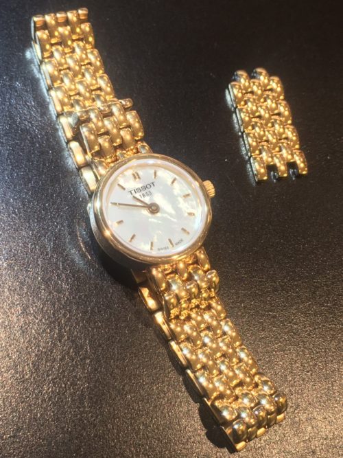 ティソの時計でございます。 シェル文字盤で金色のケース、ベルトがとても上品で綺麗なお時計です。 コマ調整のご依頼でご来店頂きました。
