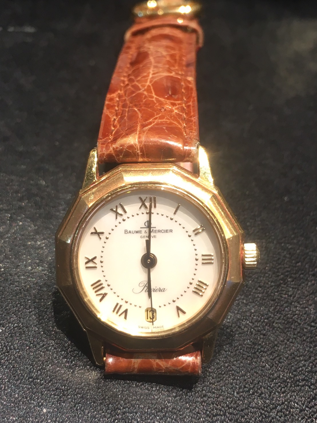 こちらの時計は25年前、お客様が旦那様にプレゼントしてもらったお品物だそうです。この時計の前の時計がとても気に入っていたそうですが、旦那様がその時計をなくしてしまい、代わりにこちらの時計をプレゼントされたそうです。