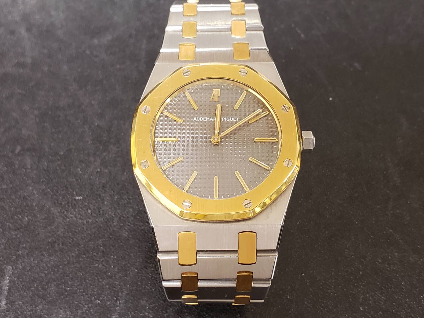 オーデマピゲのロイヤルオークでございます。 雲上時計、世界三大時計と呼ばれ時計好きの憧れのメーカーです。 ピシッと綺麗に研磨されたケースは上品かつ男らしさも感じられいつかは付けたいと感じさせられる輝きを放っています。 当店ではこういった複雑なケースの電池交換も承っております!