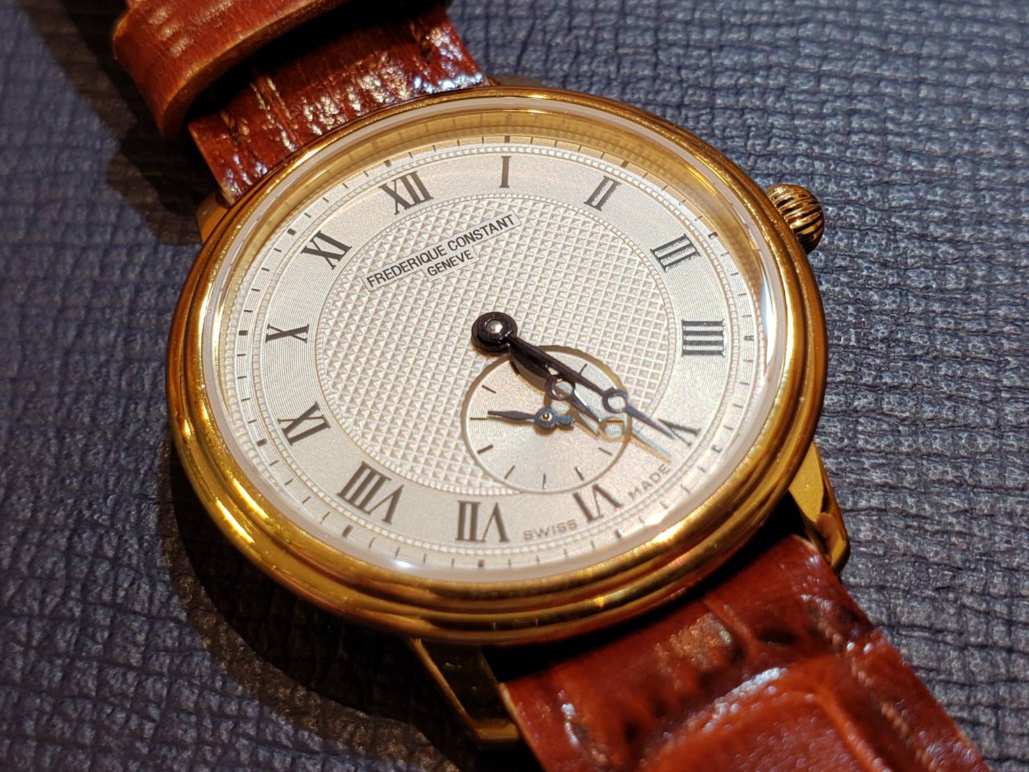 フレデリックコンスタントでございます。 フレデリックコンスタントは1988年創業と比較的歴史が浅いブランドではありますが、完全自社製ムーブメントを開発したり、クラシカルなデザインが時計愛好家の人気を集めています。 こちらのお時計も、薄型ケースのギョーシェ文字盤にブレゲ針と、クラシカルでかなり上品なデザインとなっています。 1年未満で電池が切れるという症状が起こっていました。 元通りご使用いただけるようオーバーホールさせていたしました!