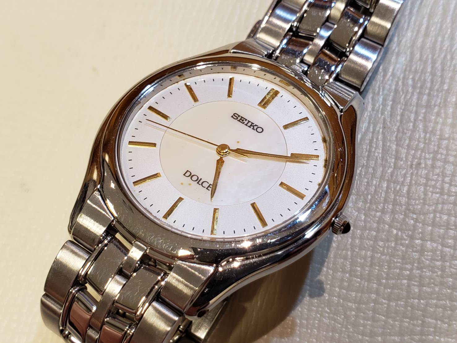 セイコーのドルチェでございます。 薄型でシンプルな3針ウォッチ。シェル文字盤と金色の針インデックスがマッチしていてとても紳士的です。 こちらは水分が侵入してしまい、その後止まってしまったそうです。