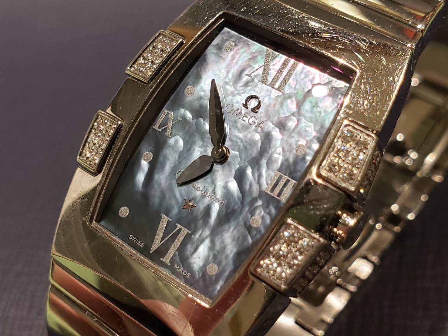 オメガ コンステレーション クアドレラでございます。 こちらのクアドレラは普通のコンステレーションのようにラウンドケースではなく、トノーケースになっています。 ダイヤモンドに見る角度で表情を変えるシェル文字盤がとても美しく、惹きつけられますね! 不動の状態でお預かりしましたが、修理により無事元通り時を刻めるようになりました!