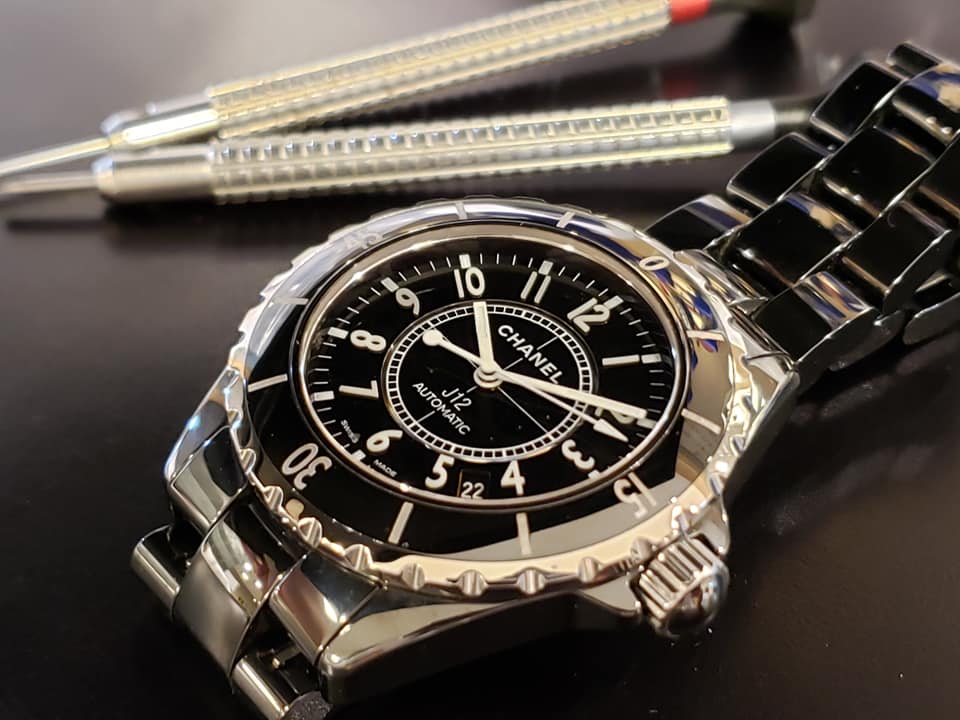 CHANELのJ12でございます。 セラミック素材の代表的なモデルとして知られるJ12ですが、非常に個性的でひと目でわかるデザインとなっています。 独特な素材感をもつセラミックは美しく、CHANELのデザインと相乗効果を生み出していますね。 こちらのお時計は、ご購入15年でメンテナンス歴なしとのことで、すぐに止まるという症状が発生していました。