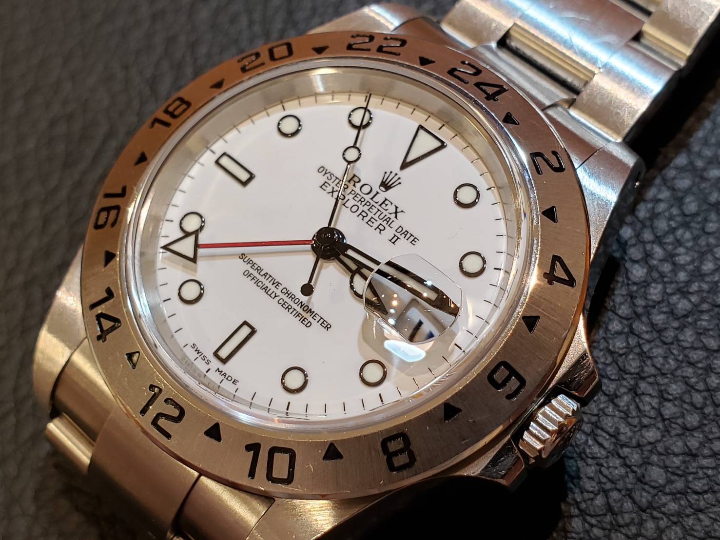 【ROLEX】 この度オーバーホールでお預かり致しましたお品物は、ROLEXのエクスプローラーIIでございます。 探検家のために作られたモデルのエクスプローラー。その上位機種として1971年に登場したのがエクスプローラーIIです。 堅牢で実用的な造りとお洒落で格好いいデザインが両立したその姿は男の憧れですね。 こちらのお時計は譲り受けられたお品物だそうで、不動となっていました.