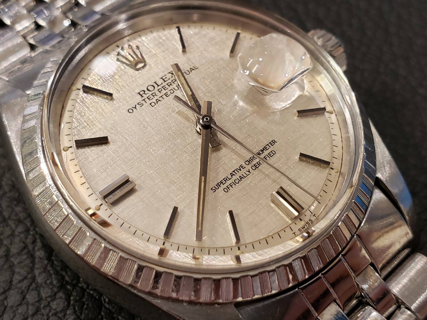 ROLEXのデイトジャストでございます。 こちらはROLEXのアンティーク品で絹目に文字盤に現在見られない針の形や立体的なバーインデックスがシックな雰囲気で格好いいですね。 こちらはお父様から受け継がれなんと合わせて50年ご使用されているお品だそうで、内装から外装まで大掛かりな修理となりました。