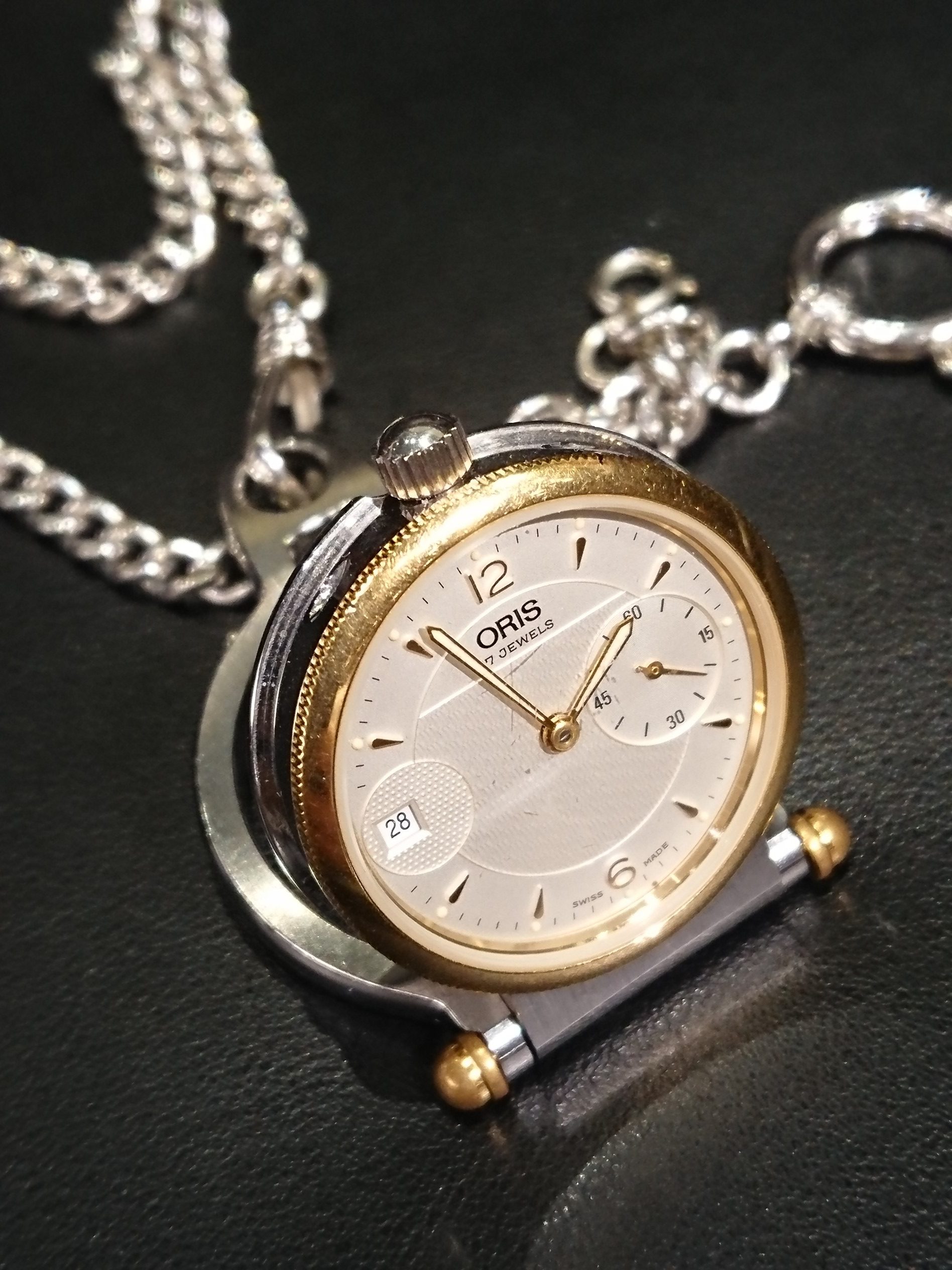 1904年、オリス川のほとりに時計工場を創設したのが始まりの、老舗ブランド。 “オリス”の社名は、近郊を流れる小川の名前に由来しています。 当時はまだ懐中時計が主流であり、腕時計は女性の装飾品という風潮があったそうですが、オリスは早い段階から紳士用腕時計の製造を始めるという、先見の明を持っていました。 この度お承りしたモデルは、その懐中時計の一つ、トラベルウォッチと呼ばれているモデルです。