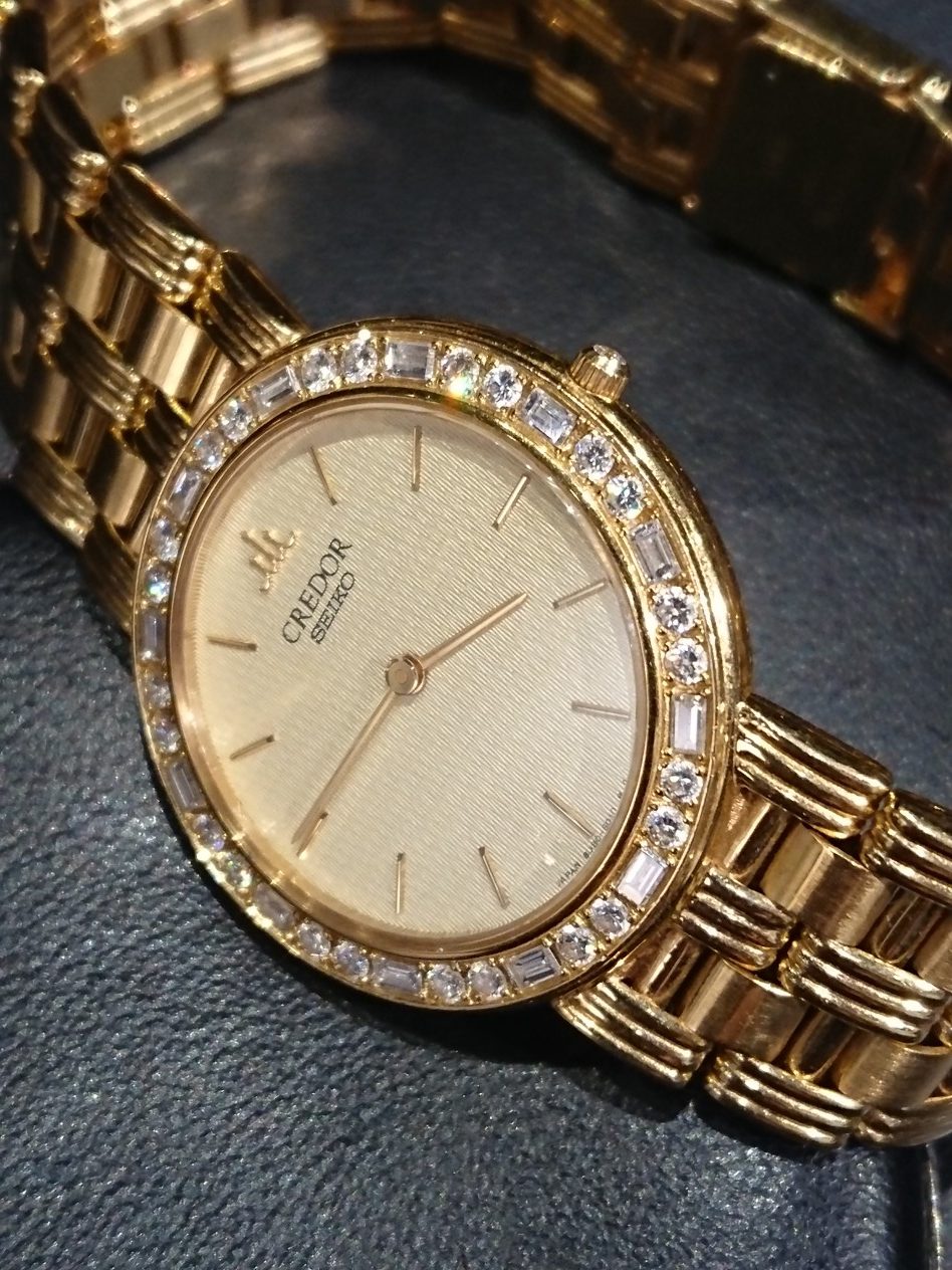 1974年の誕生以来、クレドールは国産腕時計の最高級ブランドとして君臨。ベゼルに施された大きめのラウンドダイヤモンドとバケットダイヤモンドが美しく輝いております。また文字板はシンプルながらも全面に模様が施され、上品な仕上がりとなっております。お手許を美しく彩ってくれることでしょう。