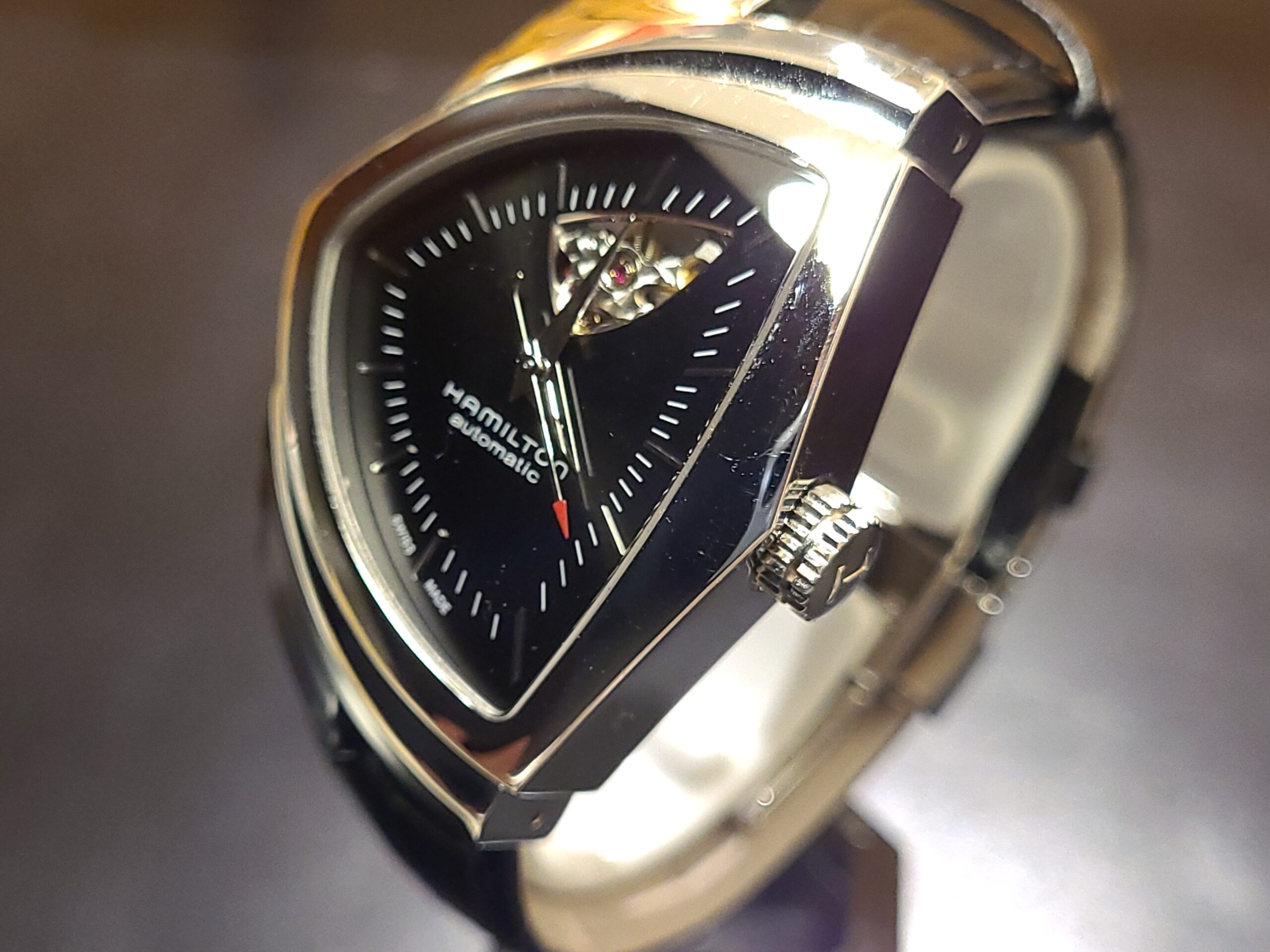 ハミルトン ベンチュラでございます。 こちらはリューズの巻真が折れてしまっていて時刻合わせ不可の状態でした。