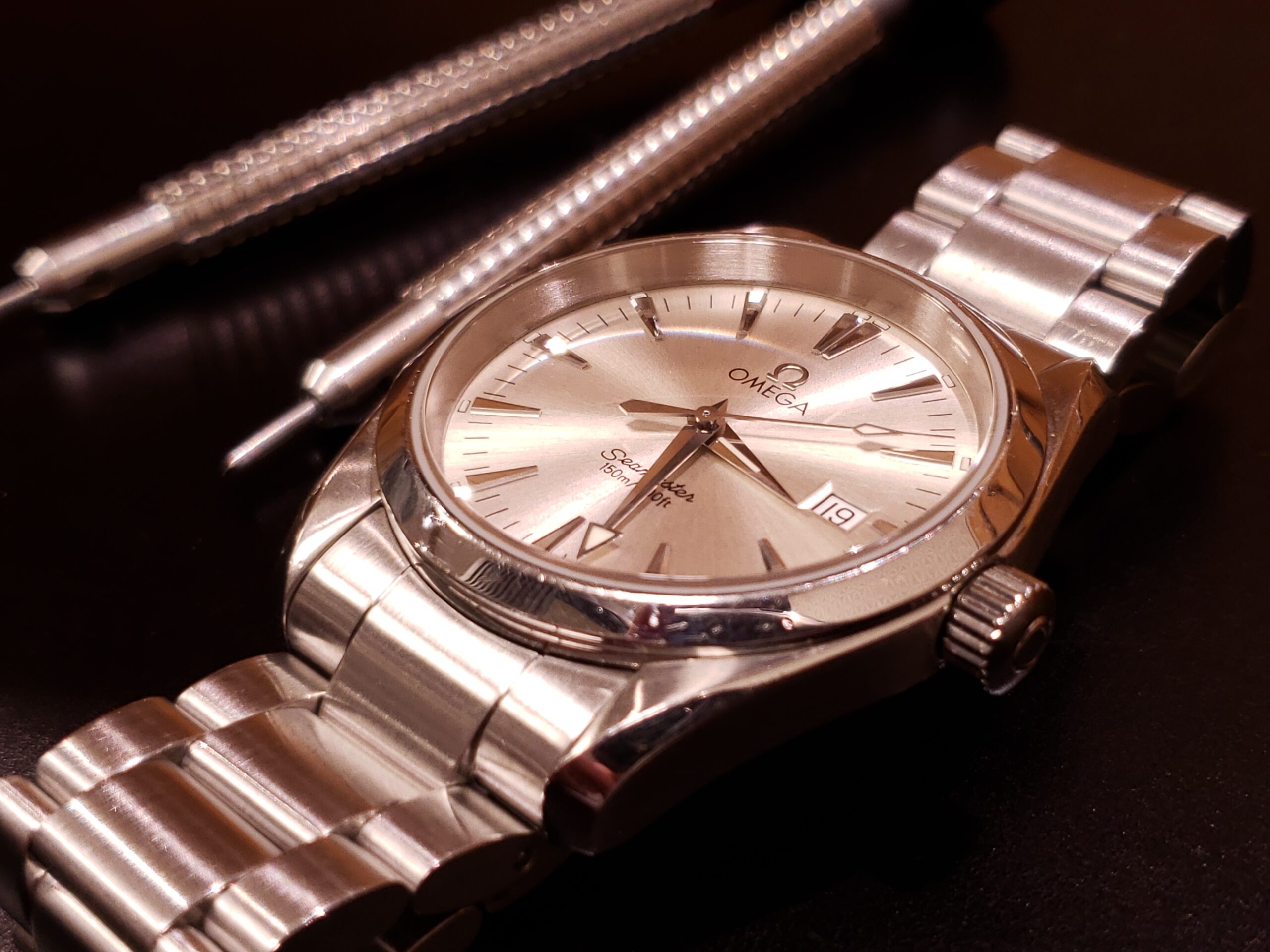 オメガ シーマスターでございます。 ベルトクラスプのバネが劣化で緩んでいて、交換が必要な状態でした。