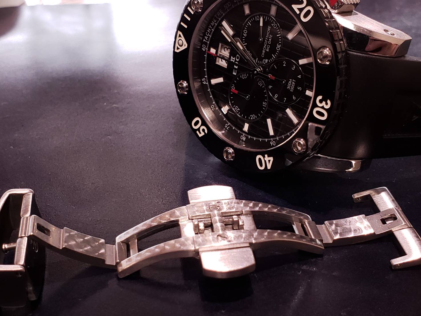 エドックスでございます。 1884年にスイスで創業した老舗のブランドで、「EDOX」とは古代ギリシャ語で「時間」を意味するそうです。 こちらはバンドのバックルのバネが劣化によりダメになってしまっていました。 修理によりしっかりと留まるようになりました!