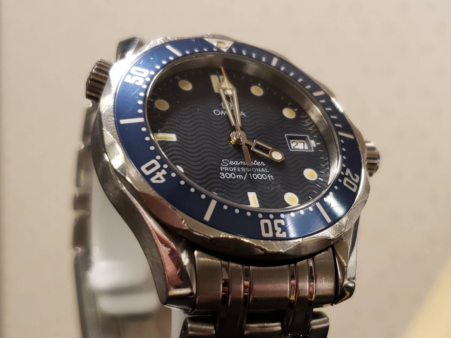 オメガ シーマスターでございます。 当店では電池交換と同時に防水テストも承っております。 一度裏蓋を開けてしまうと、防水性の保証が出来なくなってしまいます。 水仕事など、水にさらされる環境でお使いでしたら、電池交換の際には同時に防水テストもご検討ください。