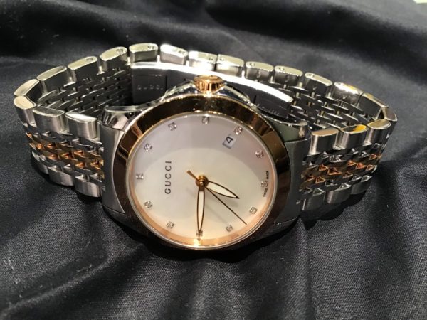 この度お預かりしました時計はグッチの時計です。 綺麗なシェル文字盤、インデックス、そしてコンビのケース・ベルトがとてもゴージャスです。