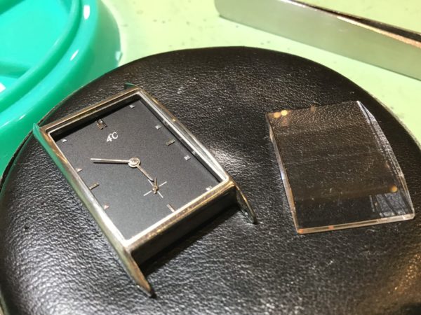この度お預かりしました時計は4℃の腕時計です。 接着剤が劣化し、とても外れやすい状態でしたので、電池交換と一緒にお修理させていただくことになりました。