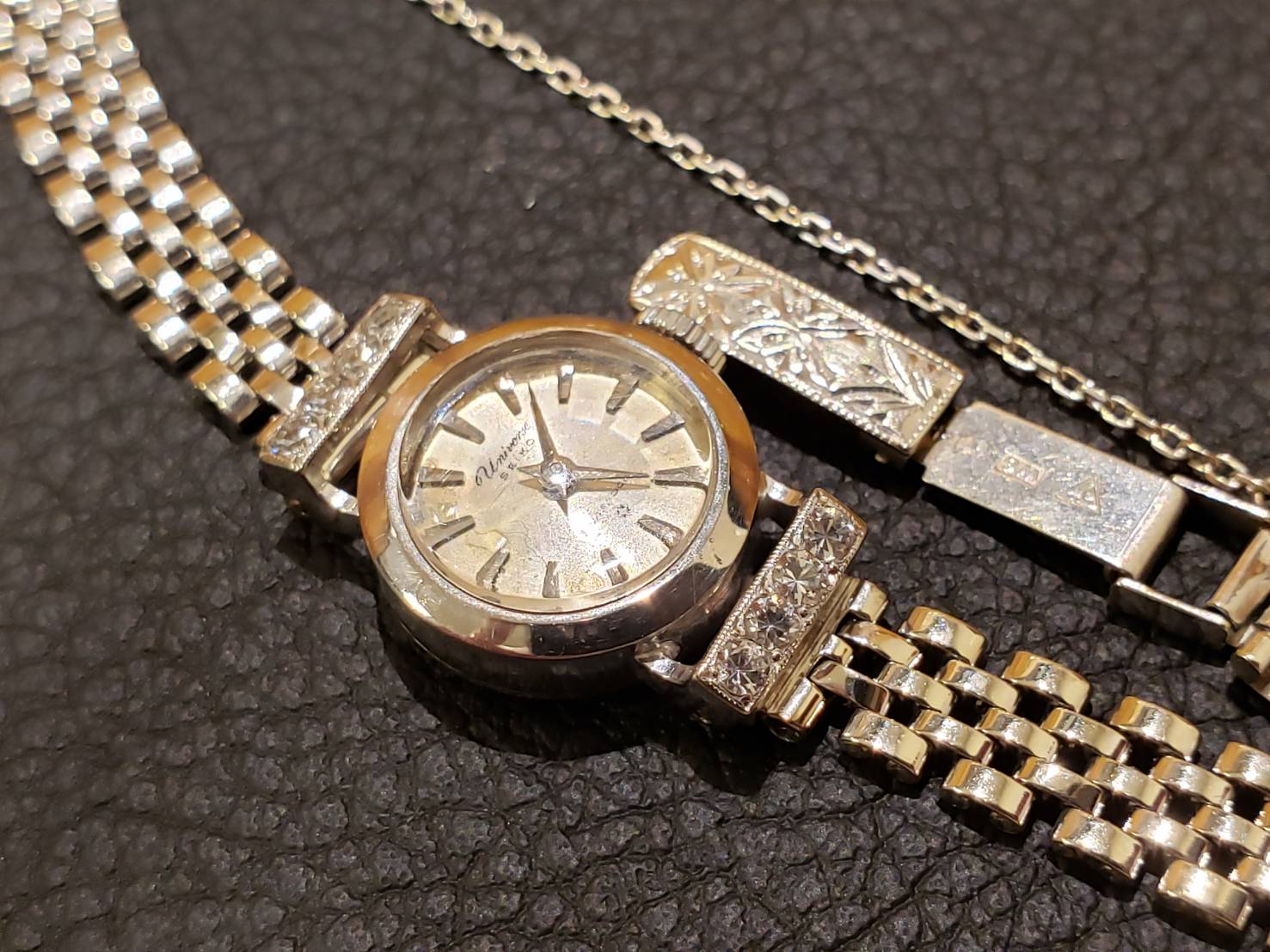 セイコーのレディース手巻きでございます。 18Kホワイトゴールドの刻印があり、白い輝きが美しいです。 クラスプ部分の彫刻がオシャレですね!