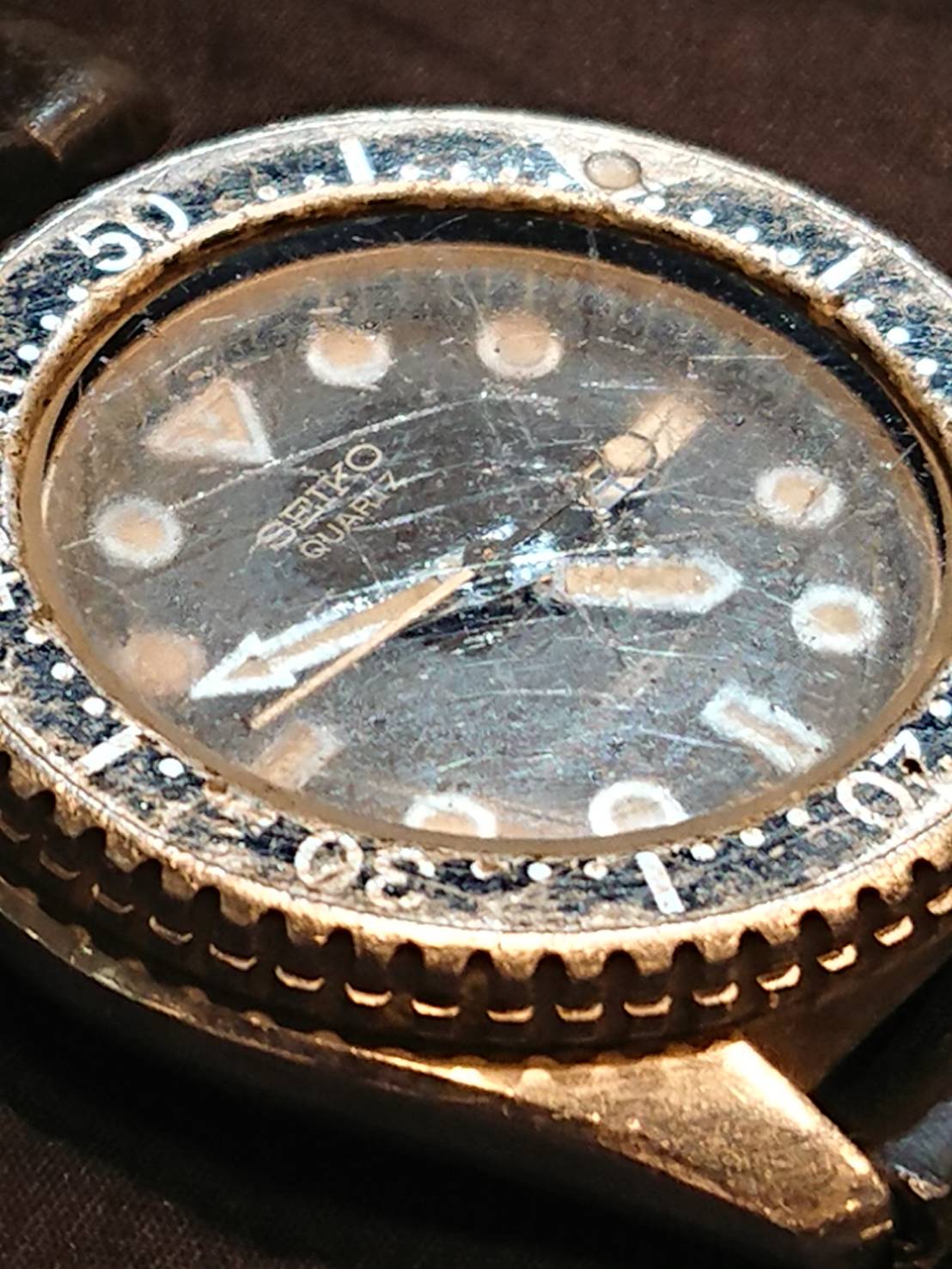 永年のご愛用で、ガラス面がキズだらけになってしまっております。ここまでになってしまいますと、時刻確認にも不便を感じていたことでしょう。