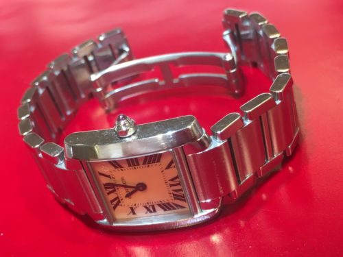 この度お預かりいたしました時計は、カルティエの時計でございます。 ベルトの留め具が弱くなり、急に外れてしまうことがあるそうなので、ご相談頂きました。