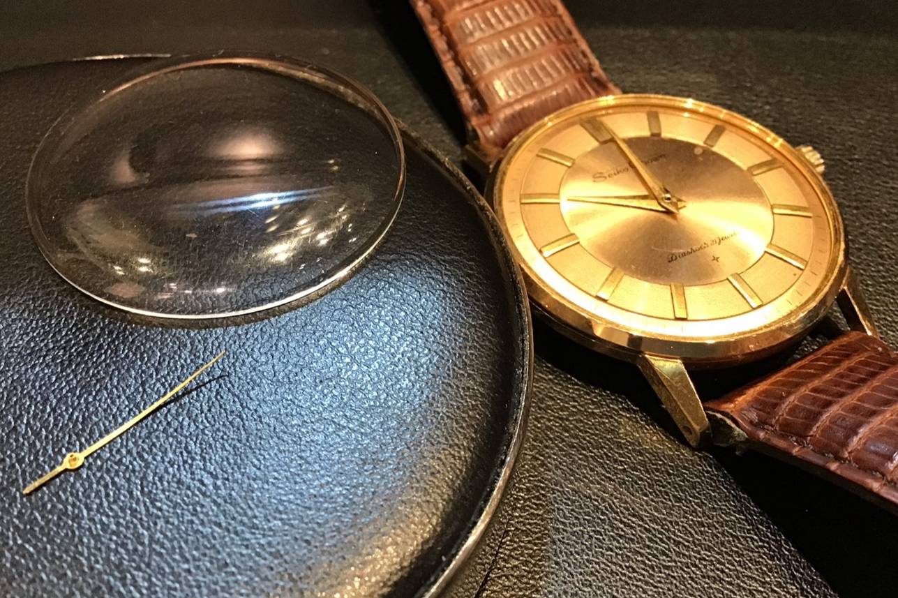 今回お預かり致しました時計は『セイコー クラウン』です。 実に綺麗な文字盤で、アンティークモデルではありますが、文字盤に腐食はなく、外装面はとても良い状態です。 しかし、着用中にぶつけてしまい、風防と秒針が外れてしまったそうで、当店にお持ち込みくださいました。 また、秒針の先が曲がってしまっているので、そちらも合わせて、修理させていただきます。 お手元に戻るまで、もうしばらくお待ちくださいませ。