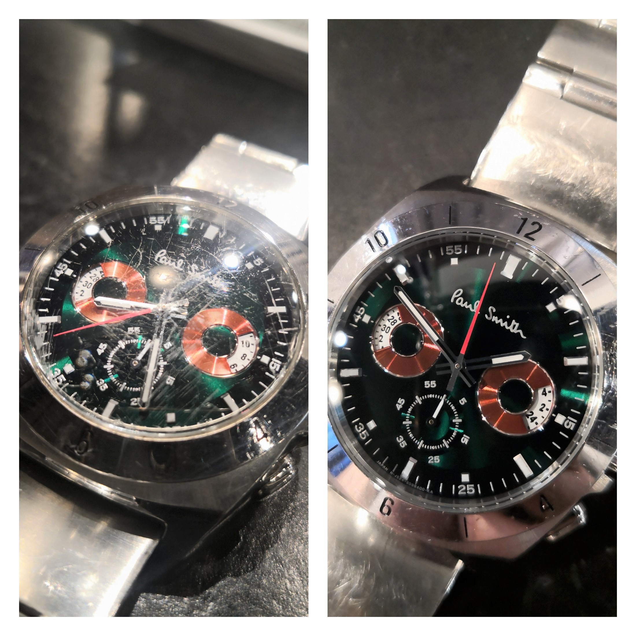 この度お預かり致しましたお品は、Paul Smithの腕時計です。 ガラス交換のご依頼でお越し下さいました。ありがとうございます。 小傷で見えづらくなっていた文字盤が、きれいに見えるようになりました。 また、何かございましたらご相談下さいませ。 これからもお気に入りを末長くお使い頂けるように、 分解掃除もご検討頂ければと思います。