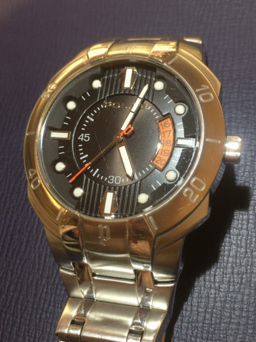 この度お預かり致しました時計はポリスの腕時計でございます。 メンズサイズの時計で、黒文字盤に白の時分針と赤の秒針が付いていて、とてもかっこよくて見やすいです。 お子様に時計を投げられて、秒針が外れてしまったそうです。