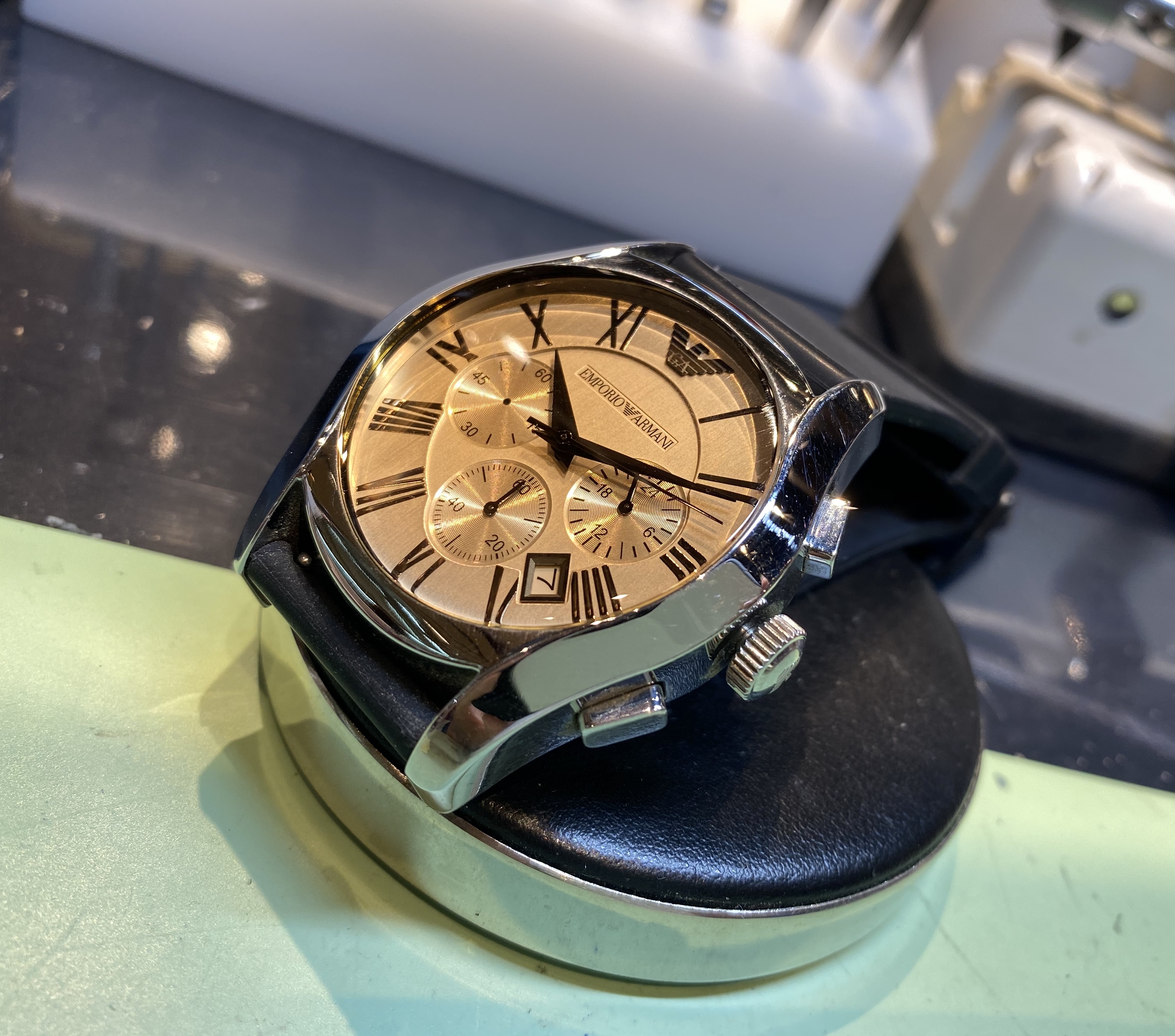 今回お預りしました時計はアルマーニにクォーツ時計です。 アルマーニは人気の高いファッションブランドですが、時計のデザインは以外にもクラシックです。ファッションブランドの時計にありがちな奇抜なデザインはあまり採用されず、時計専業メーカーが手がけるような質実剛健なクロノグラフやドレスウォッチを展開しています。
