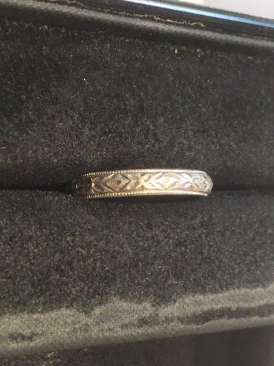 今回はプラチナのリングをお預り頂きました。 お母さまから譲り受けた彫刻リングですが、絶対自分の身に付けたいので、サイズ直しをお持込みくださいました。
