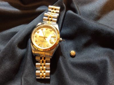 今回お預かりしましたお時計は、「ROLEX デイトジャスト」です。 リューズが抜け落ちてしまったので、修理してほしいとお持ちいただきました。 防水にかかわる大事なところなので、防水検査込みでお預りしました。