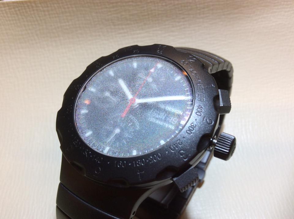今回お持込み頂きましたお時計は、スポーツカーで有名な「ポルシェ」、その会社が出している「ポルシェ デザイン」のクロノグラフ時計です。 写真の通り、文字板が見えないくらい曇ってしまっております。 分解掃除をお勧めしますが、すぐに使用したいとの事です。 一旦、応急処置としてくもり取りを致しました。