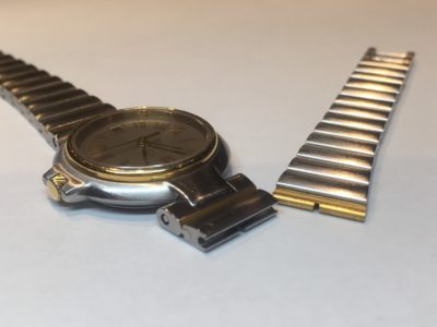 ベルトには長さを調節するために外せるコマがあります。しかしこの時計は、ながくご愛用されていて、ベルトのコマの本来なら外れてはいけないところが、外れてしまったとのことでお持込みいただきました。